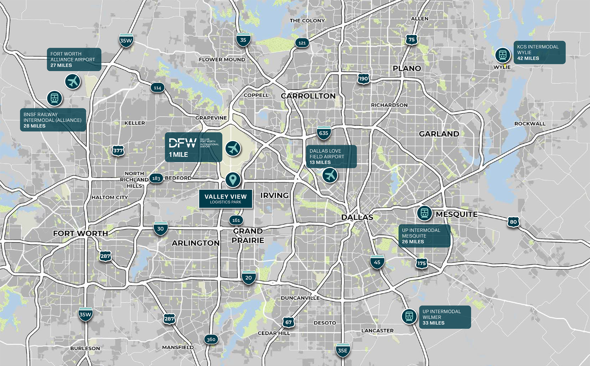 Direct connectivity to DFW International Airport and multiple regional rail intermodal facilities enables efficient national and global distribution.