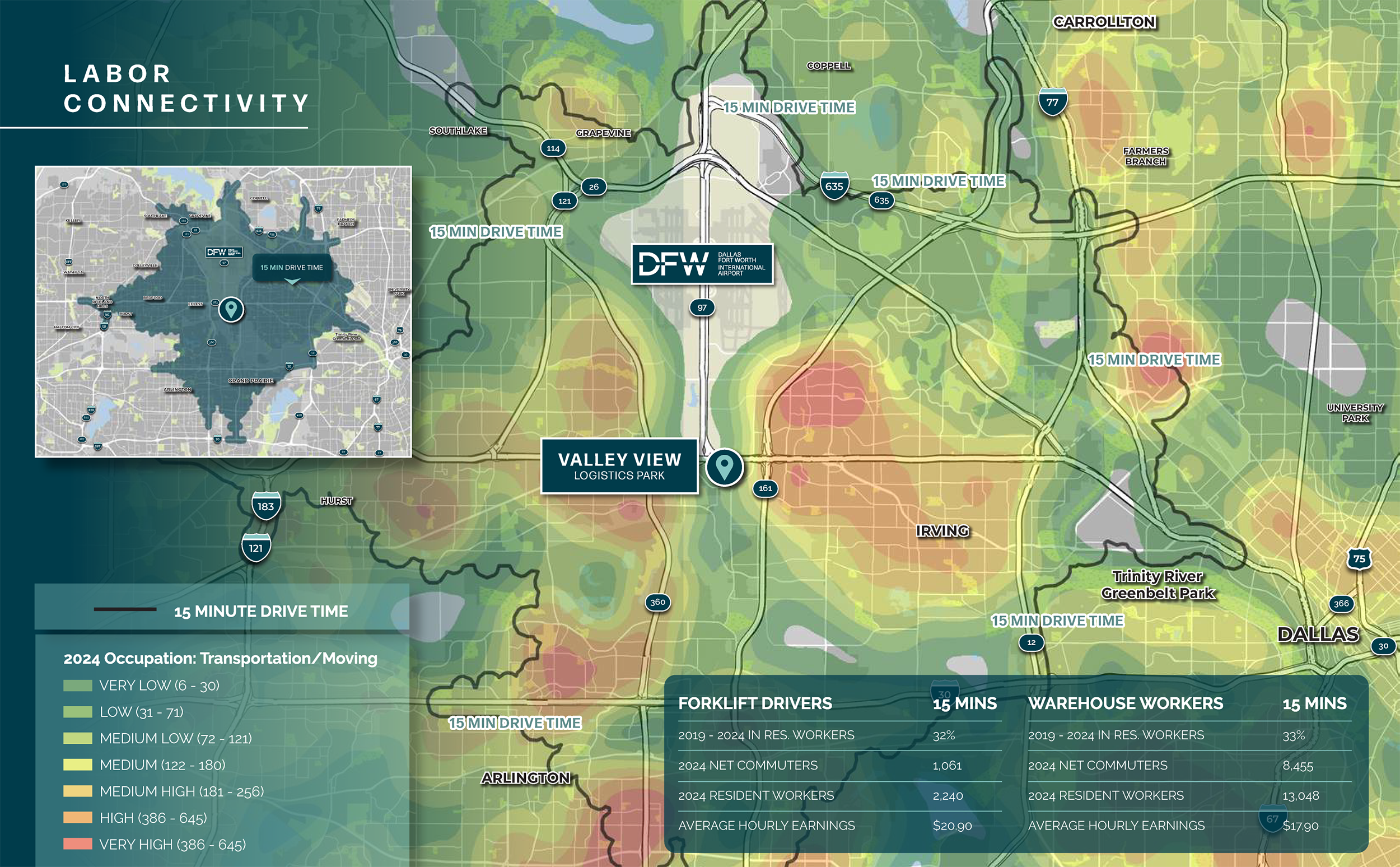 Access to a deep and growing warehouse workforce within a 15‑minute drive, supported by Irving’s central DFW location and competitive labor costs.
